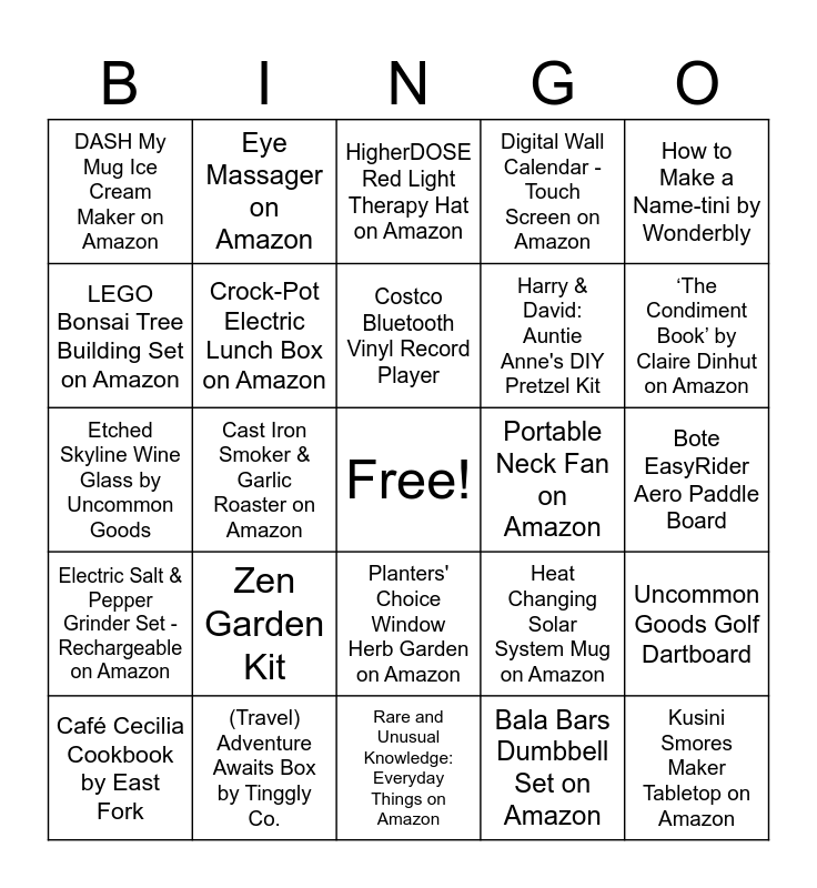 This bingo card has a free space and 24 words: Zen Garden Kit, (Travel) Adventure Awaits Box by Tinggly Co., Costco Bluetooth Vinyl Record Player, Café Cecilia Cookbook by East Fork, How to Make a Name-tini by Wonderbly, DASH My Mug Ice Cream Maker on Amazon, LEGO Bonsai Tree Building Set on Amazon, Eye Massager on Amazon, Portable Neck Fan on Amazon, Planters' Choice Window Herb Garden on Amazon, Harry & David: Auntie Anne's DIY Pretzel Kit, Etched Skyline Wine Glass by Uncommon Goods, Heat Changing Solar System Mug on Amazon, Uncommon Goods Golf Dartboard, Crock-Pot Electric Lunch Box on Amazon, Bala Bars Dumbbell Set on Amazon, Bote EasyRider Aero Paddle Board, HigherDOSE Red Light Therapy Hat on Amazon, ‘The Condiment Book’ by Claire Dinhut on Amazon, Cast Iron Smoker & Garlic Roaster on Amazon, Kusini Smores Maker Tabletop on Amazon, Electric Salt & Pepper Grinder Set -Rechargeable on Amazon, Digital Wall Calendar - Touch Screen on Amazon and Rare and Unusual Knowledge: Everyday Things on Amazon.