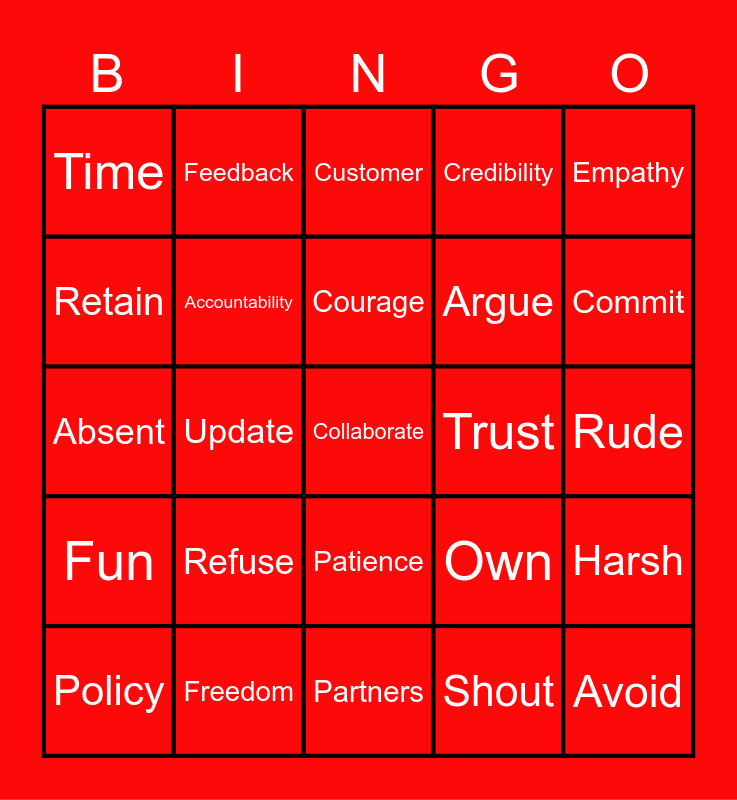 This bingo card has 2 images and 37 words: Assure, Accountability, Policy, Patience, Courage, Resolve, Empathy, Fun, Update, Credibility, Collaborate, Rude, Trust, Refuse, Listen, Time, Delight, Own, Retain, Partners, Argue, Commit, Understand, Align, Avoid, Loyalty, Engage, Feedback, Talk, Solution, Customer, Freedom, Shout, Neglect, Harsh, Absent and Hesitate.