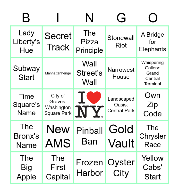 This bingo card has a free space and 24 words: New AMS, The First Capital, Wall Street's Wall, The Big Apple, A Bridge for Elephants, Lady Liberty's Hue, Subway Start, Secret Track, Landscaped Oasis: Central Park, Pinball Ban, Narrowest House, Time Square's Name, Gold Vault, The Chrysler Race, Manhattanhenge, Oyster City, Own Zip Code, The Pizza Principle, Whispering Gallery: Grand Central Terminal, City of Graves: Washington Square Park, Yellow Cabs' Start, The Bronx's Name, Stonewall Riot and Frozen Harbor.