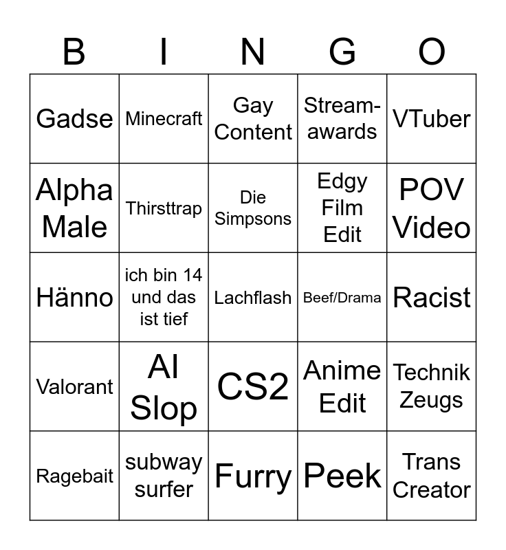 This bingo card has a free space and 24 words: AI Slop, subway surfer, Die Simpsons, Ragebait, VTuber, Gadse, Alpha Male, Minecraft, Beef/Drama, CS2, Edgy Film Edit, Hänno, Anime Edit, Technik Zeugs, Thirsttrap, Peek, Racist, Gay Content, POV Video, ich bin 14 und das ist tief, Trans Creator, Valorant, Stream- awards and Furry.