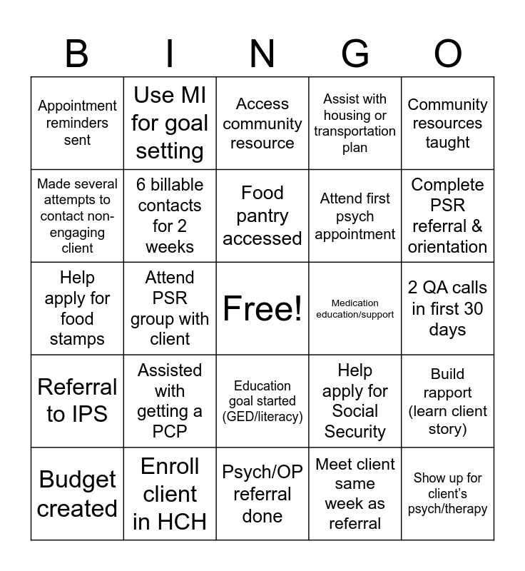 This bingo card has a free space and 25 words: Assisted with getting a PCP, Psych/OP referral done, Food pantry accessed, Budget created, Community resources taught, Appointment reminders sent, Made several attempts to contact non-engaging client, Use MI for goal setting, Medication education/support, Education goal started (GED/literacy), Attend first psych appointment, Help apply for food stamps, Help apply for Social Security, Build rapport (learn client story), 6 billable contacts for 2 weeks, Complete MBS within 30 days, 2 QA calls in first 30 days, Access community resource, Complete PSR referral & orientation, Attend PSR group with client, Show up for client’s psych/therapy, Enroll client in HCH, Referral to IPS, Assist with housing or transportation plan and Meet client same week as referral.