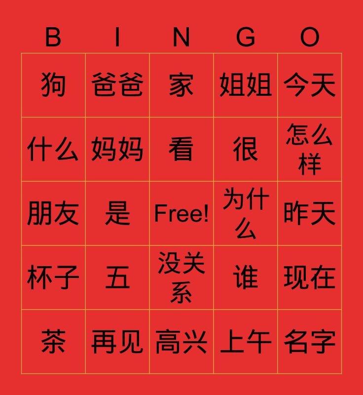 This bingo card has a free space and 75 words: 我, 喜欢, 家, 不, 人, 口, 吃, 水, 中国, 美国, 大, 书, 看, 什么, 叫, 是, 有, 名字, 好, 今天, 明天, 朋友, 妈妈, 爸爸, 姐姐, 妹妹, 哥哥, 弟弟, 可是, 学生, 老师, 学校, 你, 谁, 怎么样, 很, 没, 在, 昨天, 上午, 中午, 晚上, 年, 天, 点, 医生, 茶, 狗, 汉字, 对不起, 谢谢, 没关系, 说, 对, 去, 元, 一, 二, 三, 四, 五, 六, 七, 八, 九, 为什么, 月, 号, 星期, 现在, 杯子, 再见, 工作, 高兴 and 冷.