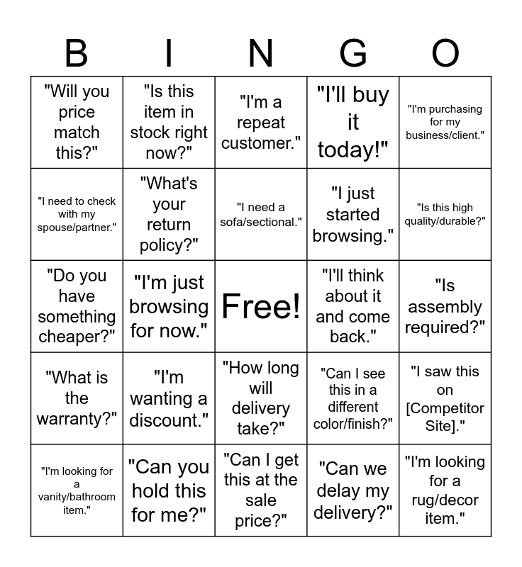 This bingo card has a free space and 25 words: "I'm wanting a discount.", "Can I get this at the sale price?", "I need a sofa/sectional.", "I'm looking for a vanity/bathroom item.", "I'm purchasing for my business/client.", "Will you price match this?", "I need to check with my spouse/partner.", "Is this item in stock right now?", "I'll think about it and come back.", "How long will delivery take?", "I just started browsing.", "Do you have something cheaper?", "Can I see this in a different color/finish?", "I saw this on [Competitor Site].", "What's your return policy?", "I need a quick-ship item.", "Is assembly required?", "I'm a repeat customer.", "Is this high quality/durable?", "I'm just browsing for now.", "I'm looking for a rug/decor item.", "Can you hold this for me?", "What is the warranty?", "I'll buy it today!" and "Can we delay my delivery?".