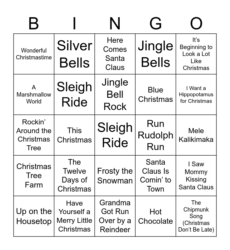 This bingo card has 35 words: Free!, Winter Wonderland, Let It Snow! Let It Snow! Let It Snow!, Sleigh Ride, Frosty the Snowman, Jingle Bells, A Marshmallow World, Do You Want to Build a Snowman?, Jingle Bell Rock, Holly Jolly Christmas, Rockin’ Around the Christmas Tree, It’s Beginning to Look a Lot Like Christmas, All I Want for Christmas Is You, Last Christmas, Wonderful Christmastime, Run Rudolph Run, Hot Chocolate, This Christmas, Christmas Tree Farm, Sleigh Ride, Santa Claus Is Comin’ to Town, Up on the Housetop, I Saw Mommy Kissing Santa Claus, Have Yourself a Merry Little Christmas, Here Comes Santa Claus, I Want a Hippopotamus for Christmas, The Chipmunk Song (Christmas Don’t Be Late), I’ll Be Home for Christmas, Blue Christmas, Mele Kalikimaka, You’re a Mean One, Mr. Grinch, Grandma Got Run Over by a Reindeer, The Twelve Days of Christmas, Silver Bells and Carol of the Bells.