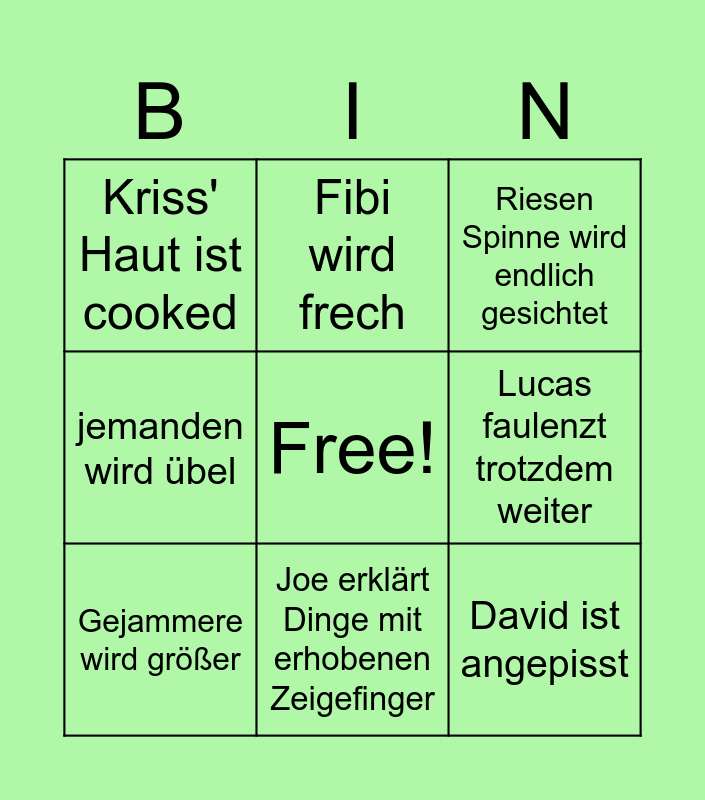 This bingo card has a free space and 8 words: Lucas faulenzt trotzdem weiter, Riesen Spinne wird endlich gesichtet, Fibi wird frech, Gejammere wird größer, Kriss' Haut ist cooked, David ist angepisst, jemanden wird übel and Joe erklärt Dinge mit erhobenen Zeigefinger.
