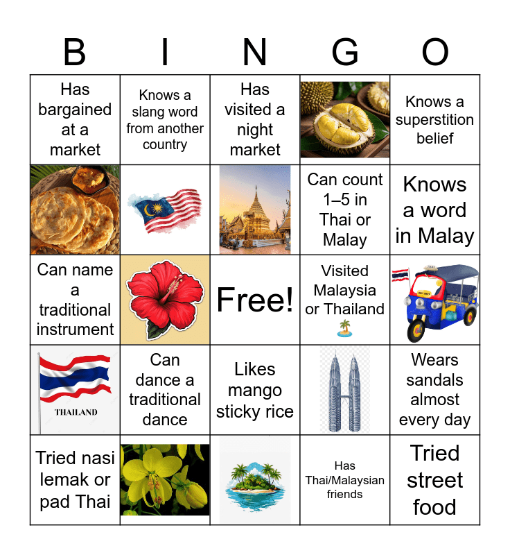 This bingo card has 10 images, a free space and 19 words: Tried nasi lemak or pad Thai, Watched a Thai drama or Malaysian film, Knows a word in Thai, Has bargained at a market, Has visited a night market, Can dance a traditional dance, Visited Malaysia or Thailand 🏝️, Tried street food, Has Thai/Malaysian friends, Knows a word in Malay, Loves spicy food, Likes mango sticky rice, Knows a superstition belief, Can name a traditional instrument, Worn traditional clothes, Can count 1–5 in Thai or Malay, Knows a slang word from another country, Wears sandals almost every day and Has been stuck in monsoon rain before.