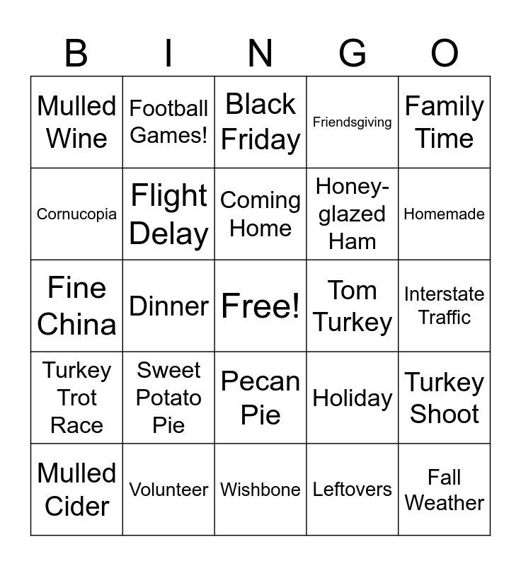 This bingo card has a free space and 75 words: Acorns, Biscuits, Black Friday, Blessings, Board Games, Bountiful, Butterball, Buttered Rolls, Butternut Squash, Casseroles, Centerpiece, Cheers!, Coming Home, Cornucopia, Cranberry Sauce, Dinner, Drumstick, Fall Weather, Family Feast, Family Time, Fellowship, Fine China, Flight Delay, Football Games!, Friendsgiving, Gizzards, Gobble, Grandparents, Gratitude, Gravy, Green Beans, Happy Thanksgiving!, Harvest Time, Holiday, Homemade, Honey-glazed Ham, Indian corn, Indigenous, Interstate Traffic, Leftovers, Let Us Give Thanks, Macy's Parade, Marshmallows, Mashed Potatoes, Mayflower, McCormick, Mulled Cider, Mulled Wine, Naptime!, November, Pass the Gravy!, Pecan Pie, Pilgrims, Plymouth Rock, Pumpkin Pie, Pumpkins, Scarecrow, Settlers, Stove Top, Stuffing, Sweet Potato Pie, Table Runner, Thankfulness, Thursday, Tofurky, Tom Turkey, Traditions, Travel Time, Trimmings, Turkey Shoot, Turkey Trot Race, Volunteer, Wampanoag, Wishbone and Yams.