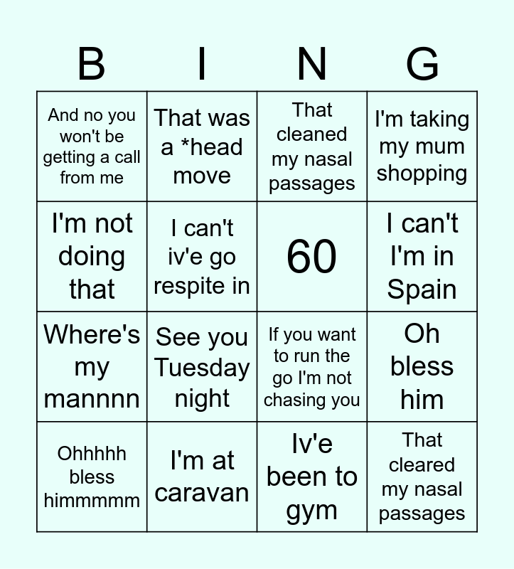 This bingo card has 23 words: That cleared my nasal passages, I'm not doing that, I can't I'm in Spain, Iv'e been to gym, I'm not doing that, And no you won't be getting a call from me, I can't iv'e go respite in, That was a *head move, Ohhhhh bless himmmmm, Noooooo, See you Tuesday night, Where's my mannnn, Lief whats that !!, I'm taking my mum shopping, I'm at caravan, Brotherrrr, That cleaned my nasal passages, If you want to run the go I'm not chasing you, 60, Oh bless him, I'm taking my mum shopping, Iv'e been to gym and Where's my mannnnn.