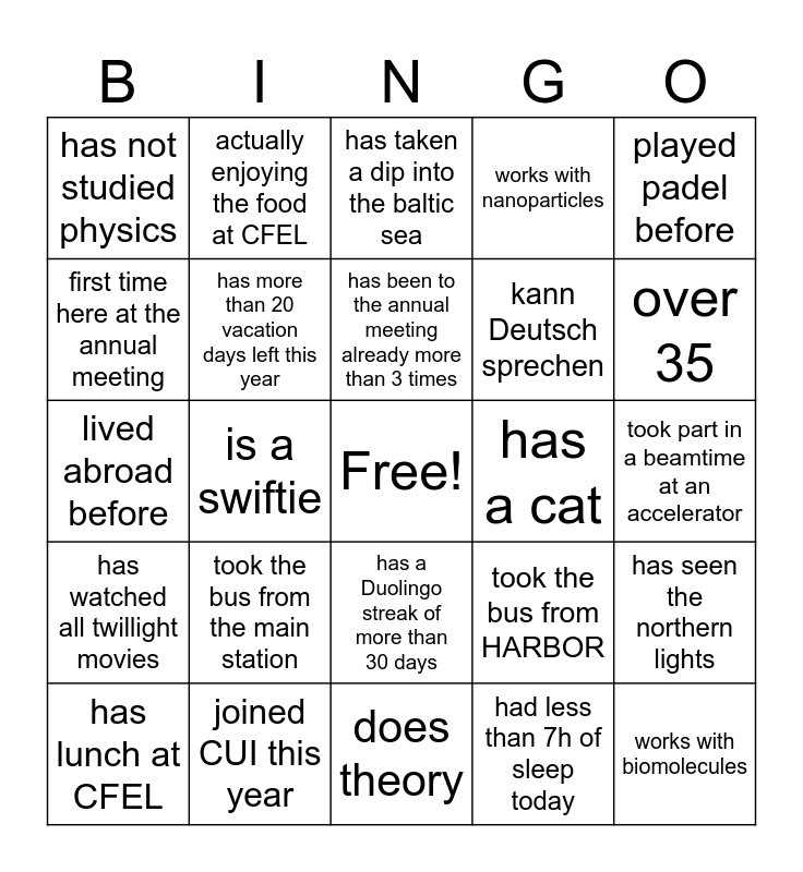 This bingo card has a free space and 33 words: works at the chemistry department, uses laser goggles, is a swiftie, brings one of the hosts a beer, has watched all twillight movies, has more than 20 vacation days left this year, played padel before, has lunch at CFEL, actually enjoying the food at CFEL, has lunch at the DESY main canteen, has been to the annual meeting already more than 3 times, has taken a dip into the baltic sea, puedes hablar espanol?, has a dog, has a cat, over 35, joined CUI this year, lived abroad before, took the bus from the main station, took the bus from HARBOR, has a Duolingo streak of more than 30 days, is using acetone on a regular basis, has not studied physics, took part in a beamtime at an accelerator, does theory, works with biomolecules, works with nanoparticles, kann Deutsch sprechen, first time here at the annual meeting, has seen the northern lights, took part in DynaMENT, had less than 7h of sleep today and usually works below 273.15K.