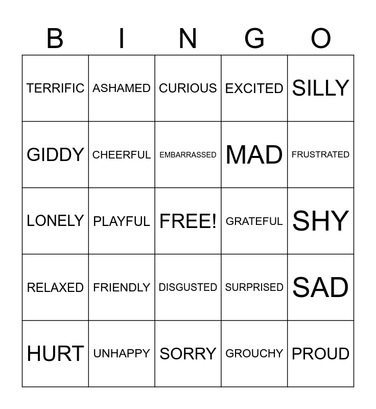 This bingo card has a free space and 36 words: WORRIED, PLEASED, ANXIOUS, CHEERFUL, SURPRISED, RELAXED, EMBARRASSED, NERVOUS, SILLY, HAPPY, PLAYFUL, EXCITED, BORED, GRATEFUL, FRUSTRATED, TERRIFIC, BRAVE, FRIENDLY, PROUD, CURIOUS, SHY, SAD, UNHAPPY, HURT, SORRY, ASHAMED, LONELY, TIRED, MAD, GIDDY, ANNOYED, MEAN, GROUCHY, DISGUSTED, AFRAID and CONFUSED.