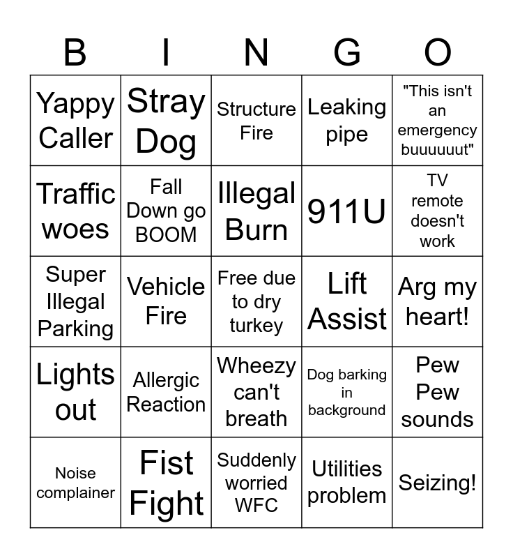 This bingo card has a free space and 24 words: Allergic Reaction, Fist Fight, Illegal Burn, Noise complainer, "This isn't an emergency buuuuuut", Yappy Caller, Traffic woes, Stray Dog, Lift Assist, Wheezy can't breath, 911U, Super Illegal Parking, Dog barking in background, Pew Pew sounds, Fall Down go BOOM, Utilities problem, Arg my heart!, Structure Fire, TV remote doesn't work, Vehicle Fire, Seizing!, Lights out, Leaking pipe and Suddenly worried WFC.