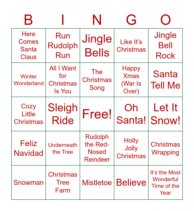 This bingo card has a free space and 28 words: Christmas Wrapping, Wonderful Christmastime, Happy Xmas (War Is Over), Believe, Winter Wonderland, Jingle Bells, Run Rudolph Run, Feliz Navidad, Oh Santa!, Snowman, Cozy Little Christmas, Like It’s Christmas, Christmas Tree Farm, Mistletoe, Santa Tell Me, Christmas (Baby Please Come Home), Underneath the Tree, All I Want for Christmas Is You, The Christmas Song, Rudolph the Red-Nosed Reindeer, Here Comes Santa Claus, Frosty the Snowman, It’s the Most Wonderful Time of the Year, Sleigh Ride, Let It Snow!, Holly Jolly Christmas, Jingle Bell Rock and Rockin’ Around the Christmas Tree.
