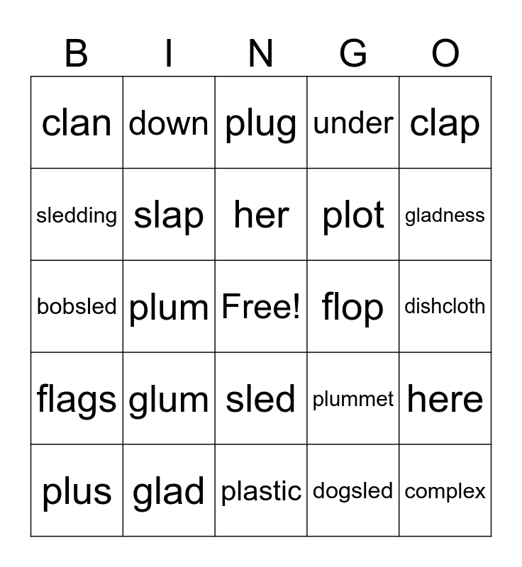 This bingo card has a free space and 29 words: plus, flip, plum, slam, clan, plug, slap, glum, flop, glad, dishcloth, complex, plastic, dogsled, gladness, clams, sled, flags, clap, bobsled, plummet, classic, plot, sledding, under, down, here, her and done.