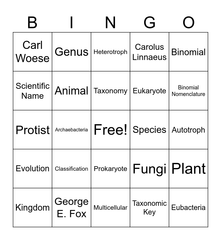 This bingo card has a free space and 24 words: Classification, George E. Fox, Taxonomy, Kingdom, Binomial, Carl Woese, Scientific Name, Genus, Species, Prokaryote, Eukaryote, Protist, Fungi, Plant, Animal, Taxonomic Key, Autotroph, Heterotroph, Binomial Nomenclature, Archaebacteria, Eubacteria, Evolution, Carolus Linnaeus and Multicellular.
