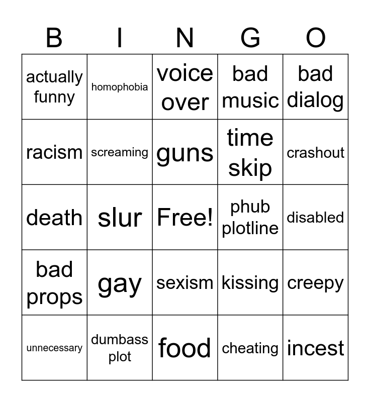 This bingo card has a free space and 24 words: gay, dumbass plot, guns, unnecessary, bad dialog, actually funny, racism, homophobia, phub plotline, sexism, time skip, death, kissing, creepy, screaming, cheating, disabled, voice over, crashout, slur, incest, bad props, bad music and food.