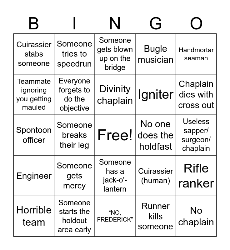This bingo card has a free space and 29 words: Horrible team, Accidentally shoot a bomber near a teammate, Someone breaks their leg, Someone gets infected, Cuirassier stabs someone, Someone gets blown up on the bridge, Everyone forgets to do the objective, Someone gets mercy, No one does the holdfast, Someone starts the holdout area early, Useless sapper/ surgeon/ chaplain, No chaplain, “NO, FREDERICK”, Runner kills someone, Chaplain dies with cross out, Someone gets a badge, Someone has a jack-o'-lantern, Engineer, Handmortar seaman, Spontoon officer, Cuirassier (human), Somebody shoots a bomber near someone, Igniter, Teammate ignoring you getting mauled, Bugle musician, Someone tries to speedrun, Rifle ranker, Divinity chaplain and Someone dies from a zapper.