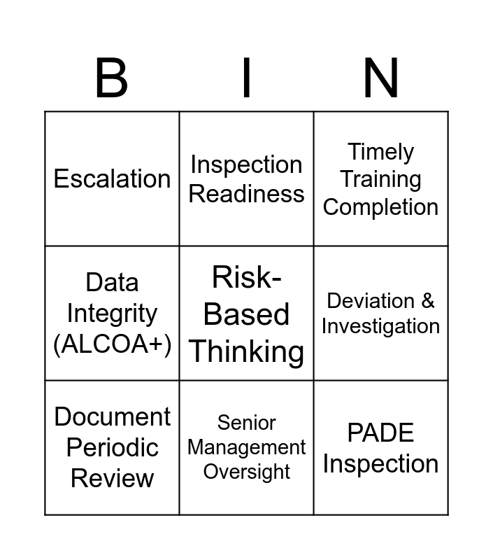 This bingo card has 9 words: Document Periodic Review, Timely Training Completion, Inspection Readiness, Data Integrity (ALCOA+), Escalation, Deviation & Investigation, Risk-Based Thinking, PADE Inspection and Senior Management Oversight.