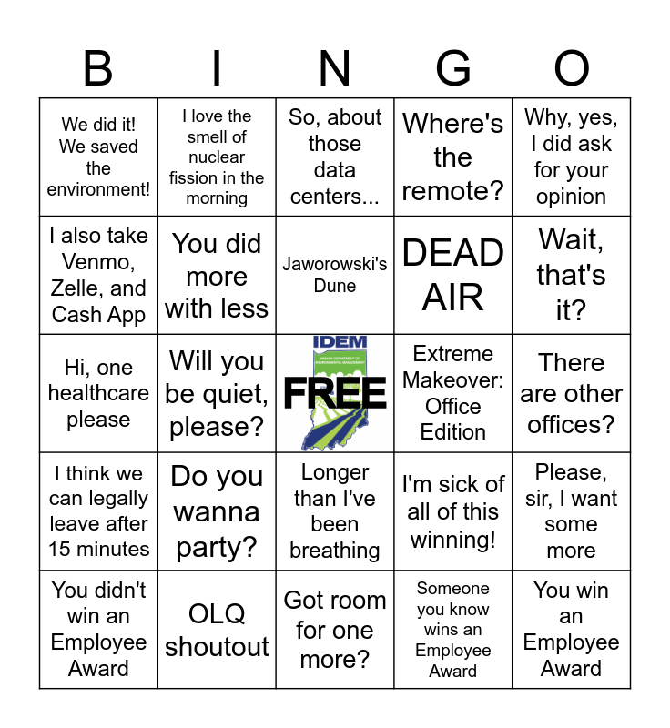 This bingo card has a free space and 34 words: GET TO DA CHOPPA!, Someone you know wins an Employee Award, I'm giving it all she's got, Captain!, "umm...", I think we can legally leave after 15 minutes, You did more with less, Why, yes, I did ask for your opinion, You didn't win an Employee Award, I love the smell of nuclear fission in the morning, Care to take a survey?, Jaworowski's Dune, So, about those data centers..., Victim of congestive traffic failure, It's a bit shady in here..., Extreme Makeover: Office Edition, Wait, that's it?, OLQ shoutout, Hi, one healthcare please, Do you wanna party?, I'm sick of all of this winning!, Longer than I've been breathing, Eeeepa!, We did it! We saved the environment!, There are other offices?, Got room for one more?, You win an Employee Award, Where's the remote?, He said it!, DEAD AIR, I also take Venmo, Zelle, and Cash App, Get off the stage!, Will you be quiet, please?, Please, sir, I want some more and We still care about those... right?.
