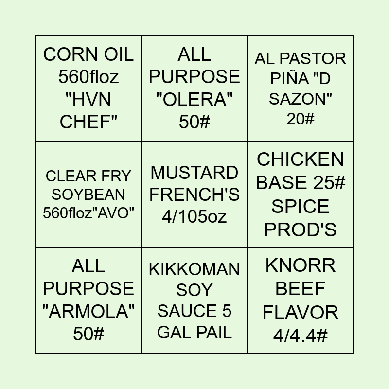 This bingo card has 9 words: ALL PURPOSE "ARMOLA" 50#, AL PASTOR PIÑA "D SAZON" 20#, ALL PURPOSE "OLERA" 50#, CLEAR FRY SOYBEAN 560floz"AVO", CORN OIL 560floz "HVN CHEF", CHICKEN BASE 25# SPICE PROD'S, MUSTARD FRENCH'S 4/105oz, KNORR BEEF FLAVOR 4/4.4# and KIKKOMAN SOY SAUCE 5 GAL PAIL.