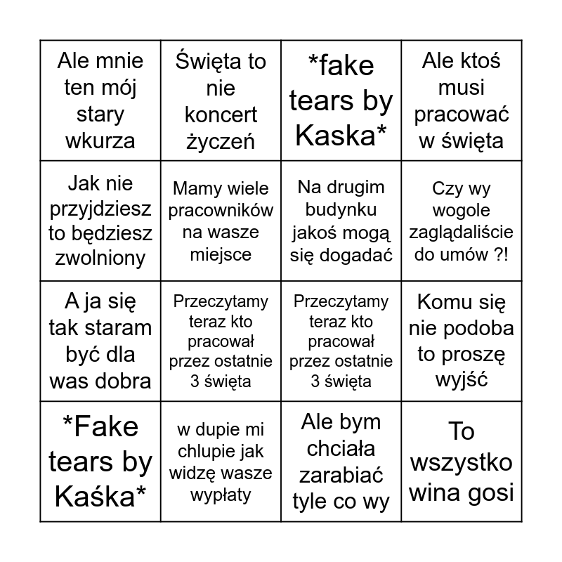 This bingo card has 21 words: w dupie mi chlupie jak widzę wasze wypłaty, Komu się nje podoba to proszę wyjść, Święta to nie koncert życzeń, Jak nie przyjdziesz to będziesz zwolniony, Ale bym chciała zarabiać tyle co wy, Na drugim budynku jakoś mogą się dogadać, Ale mnie ten mój stary wkurza, *fake tears by Kaska*, Przeczytamy teraz kto pracował przez ostatnie 3 święta, Czy wy wogole zaglądaliście do umów ?!, A ja się tak staram być dla was dobra, Ale ktoś musi pracować w święta, To wszystko wina gosi, Mieliście przeszkolenie z ewakuacji?, Mamy wiele pracowników na wasze miejsce, Jak wam się nie podoba to proszę się zwolnić, *Fake tears by Kaśka*, Przeczytamy teraz kto pracował przez ostatnie 3 święta, Jak nie przyjdziesz to będziesz zwolniony, Komu się nie podoba to proszę wyjść and Czy wy wogole zaglądaliście do umów ?!.