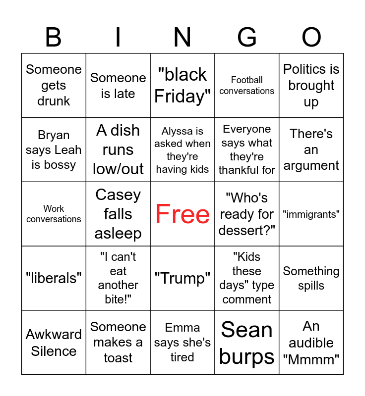 This bingo card has a free space and 24 words: "I can't eat another bite!", Someone makes a toast, Alyssa is asked when they're having kids, Awkward Silence, Politics is brought up, Someone gets drunk, Bryan says Leah is bossy, Someone is late, "Who's ready for dessert?", "Trump", Everyone says what they're thankful for, Work conversations, "Kids these days" type comment, Something spills, A dish runs low/out, Sean burps, "immigrants", "black Friday", There's an argument, Casey falls asleep, An audible "Mmmm", "liberals", Football conversations and Emma says she's tired.