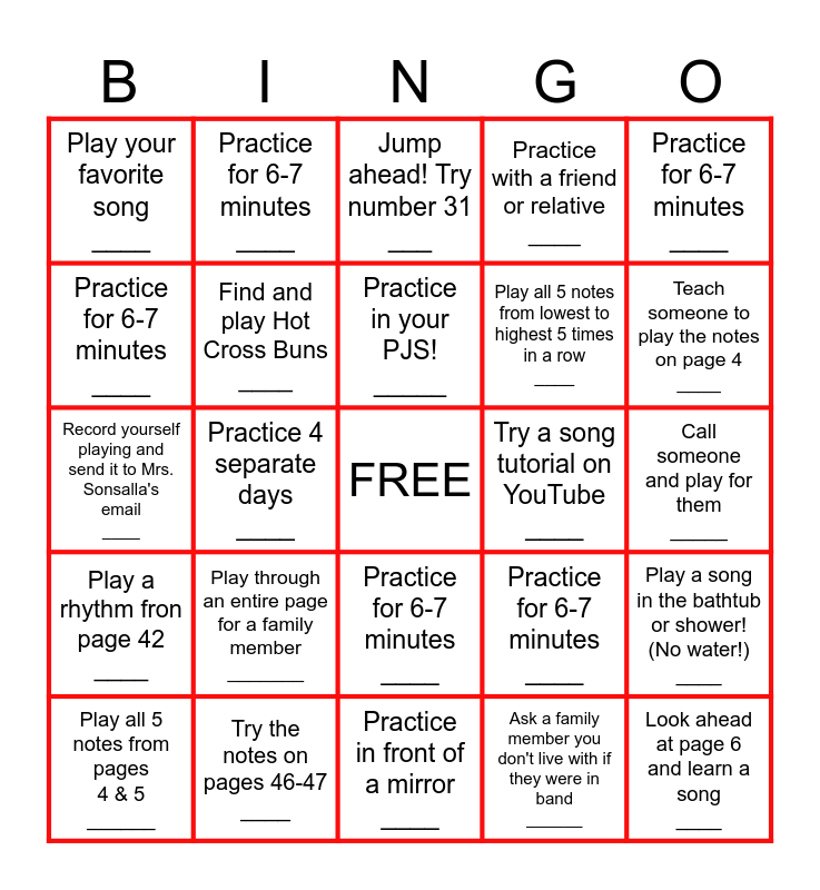 This bingo card has a free space and 24 words: Play all 5 notes from pages 4 & 5 ______, Play through an entire page for a family member _______, Practice in your PJS! _____, Ask a family member you don't live with if they were in band ______, Practice for 6-7 minutes ____, Play your favorite song ____, Practice for 6-7 minutes ____, Jump ahead! Try number 31 ___, Try a song tutorial on YouTube ____, Call someone and play for them _____, Record yourself playing and send it to Mrs. Sonsalla's email ____, Find and play Hot Cross Buns ____, Practice for 6-7 minutes ____, Play a song in the bathtub or shower! (No water!) ____, Practice for 6-7 minutes ____, Try the notes on pages 46-47 ____, Practice in front of a mirror ____, Practice with a friend or relative ____, Teach someone to play the notes on page 4 ____, Play a rhythm fron page 42 ____, Practice 4 separate days ____, Practice for 6-7 minutes ____, Play all 5 notes from lowest to highest 5 times in a row ____ and Look ahead at page 6 and learn a song ____.
