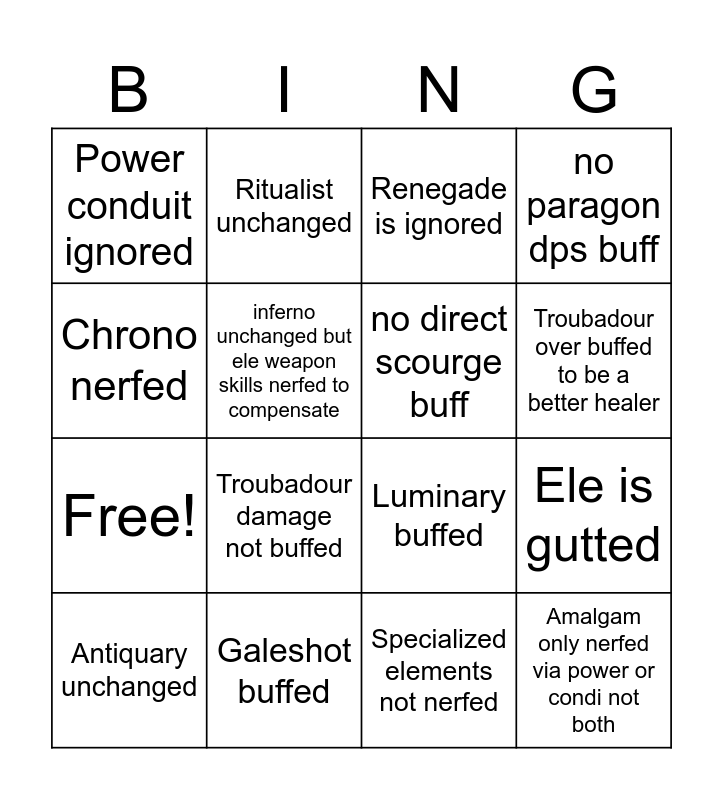 This bingo card has 20 words: Ele is gutted, Mirage change that does nothing, Renegade is ignored, Warrior unchanged, Antiquary unchanged, Chrono nerfed, Galeshot buffed, Power conduit ignored, Free!, Ritualist unchanged, Troubadour damage not buffed, Luminary buffed, inferno unchanged but ele weapon skills nerfed to compensate, Amalgam only nerfed via power or condi not both, no direct scourge buff, Mechanist nerf, Troubadour over buffed to be a better healer, no paragon dps buff, Specialized elements not nerfed and Anet butchers a spec by nerfing the class not the spec.
