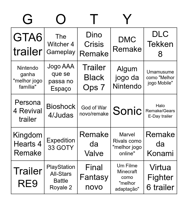 This bingo card has 25 words: Expedition 33 GOTY, Final Fantasy novo, Trailer Black Ops 7, Trailer RE9, DLC Tekken 8, GTA6 trailer, Nintendo ganha "melhor jogo família", The Witcher 4 Gameplay, Sonic, Remake da Valve, Algum jogo da Nintendo, Persona 4 Revival trailer, Marvel Rivals como "melhor jogo online", Remake da Konami, Jogo AAA que se passa no Espaço, Virtua Fighter 6 trailer, Halo Remake/Gears E-Day trailer, Dino Crisis Remake, Umamusume como "Melhor jogo Mobile", Bioshock 4/Judas, God of War novo/remake, PlayStation All-Stars Battle Royale 2, Kingdom Hearts 4 Remake, DMC Remake and Um Filme Minecraft como "melhor adaptação".