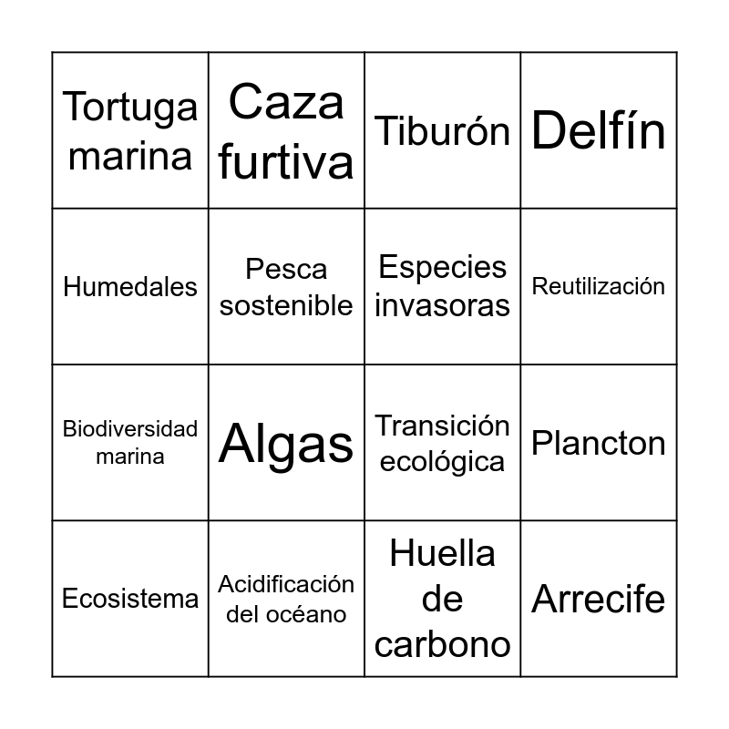 This bingo card has 90 words: Clima, Calentamiento, Emisiones, CO2, Mitigación, Adaptación, Energías renovables, Solar, Eólica, Sequía, Inundaciones, Tormentas, Resiliencia, Huella de carbono, Reciclaje, Reutilización, Sostenibilidad, Eficiencia energética, Biodiversidad, Deshielo, Glaciares, Temperatura, Contaminación, Gases de efecto invernadero, Transición ecológica, Agricultura sostenible, Reforestación, Incendios, Ecosistemas, Cambio climático, Océano, Mar, Coral, Arrecife, Tortuga marina, Delfín, Tiburón, Ballena, Plancton, Algas, Sobrepesca, Pesca sostenible, Acuicultura, Microplásticos, Contaminación marina, Vertidos, Plásticos, Salinidad, Mareas, Fondo marino, Ecosistema marino, Biodiversidad marina, Áreas protegidas, Manglares, Pastos marinos, Corrientes, Acidificación del océano, Medusas, Nódulos marinos, Crecimiento azul, Bosque, Selva, Desierto, Sabana, Suelo, Flora, Fauna, Polinizadores, Abejas, Árbol, Biodiversidad terrestre, Ecosistema, Degradación, Desertificación, Caza furtiva, Especies invasoras, Especies en peligro, Conservación, Restauración, Reforestación, Fertilidad, Humedales, Montañas, Pastizales, Ciclo del agua, Contaminación del suelo, Deforestación, Protección, Hábitat and Servicios ecosistémicos.