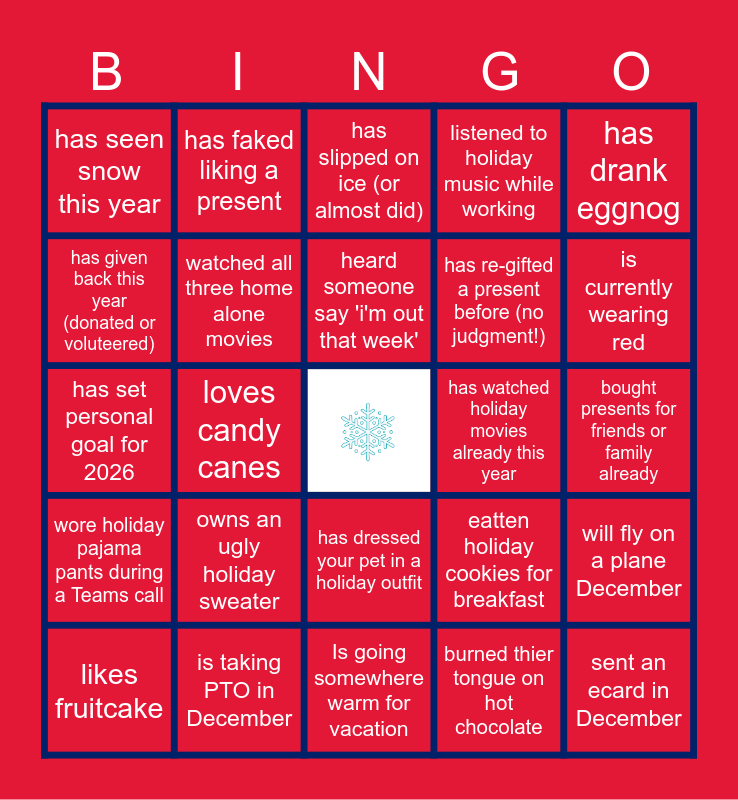 This bingo card has a free space and 24 words: owns an ugly holiday sweater, is taking PTO in December, heard someone say 'i'm out that week', likes fruitcake, has drank eggnog, has seen snow this year, has given back this year (donated or voluteered), has faked liking a present, has watched holiday movies already this year, has dressed your pet in a holiday outfit, has re-gifted a present before (no judgment!), has set personal goal for 2026, eatten holiday cookies for breakfast, will fly on a plane December, watched all three home alone movies, burned thier tongue on hot chocolate, bought presents for friends or family already, has slipped on ice (or almost did), is currently wearing red, loves candy canes, sent an ecard in December, wore holiday pajama pants during a Teams call, listened to holiday music while working and Is going somewhere warm for vacation.