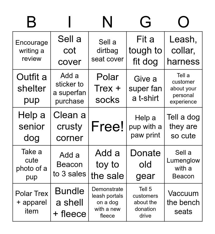 This bingo card has a free space and 24 words: Add a Beacon to 3 sales, Bundle a shell + fleece, Polar Trex + socks, Polar Trex + apparel item, Leash, collar, harness, Encourage writing a review, Outfit a shelter pup, Sell a cot cover, Help a pup with a paw print, Add a toy to the sale, Give a super fan a t-shirt, Help a senior dog, Donate old gear, Sell a Lumenglow with a Beacon, Add a sticker to a superfan purchase, Tell 5 customers about the donation drive, Tell a dog they are so cute, Sell a dirtbag seat cover, Tell a customer about your personal experience, Clean a crusty corner, Vaccuum the bench seats, Take a cute photo of a pup, Fit a tough to fit dog and Demonstrate leash portals on a dog with a new fleece.