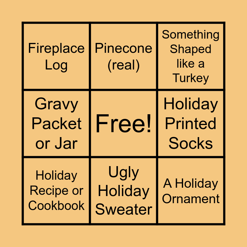 This bingo card has a free space and 8 words: Holiday Printed Socks, Something Shaped like a Turkey, Pinecone (real), Holiday Recipe or Cookbook, Fireplace Log, A Holiday Ornament, Gravy Packet or Jar and Ugly Holiday Sweater.