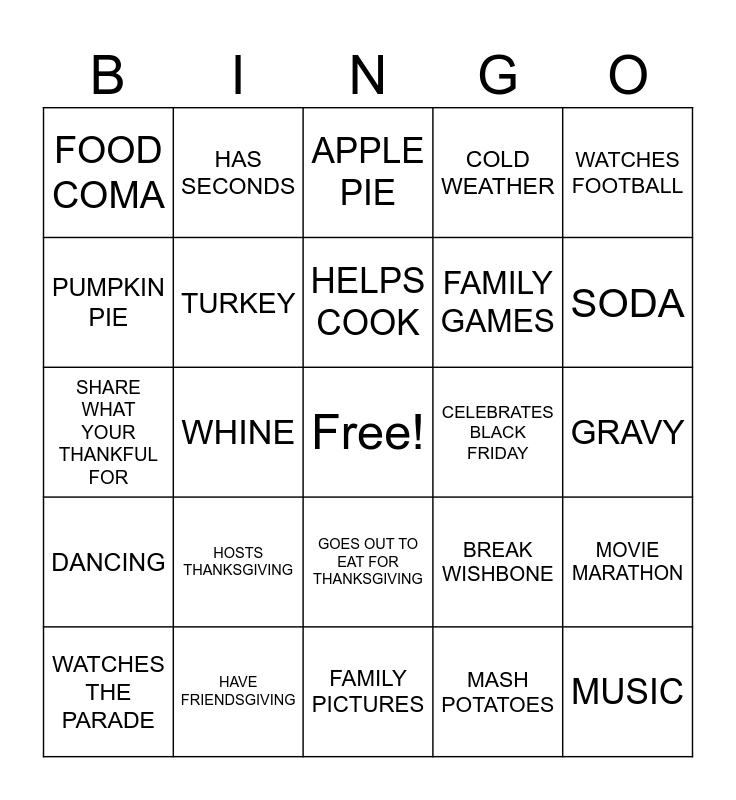 This bingo card has a free space and 24 words: HOSTS THANKSGIVING, HAVE FRIENDSGIVING, HELPS COOK, WATCHES THE PARADE, WATCHES FOOTBALL, FOOD COMA, PUMPKIN PIE, HAS SECONDS, CELEBRATES BLACK FRIDAY, GOES OUT TO EAT FOR THANKSGIVING, FAMILY GAMES, SHARE WHAT YOUR THANKFUL FOR, BREAK WISHBONE, MOVIE MARATHON, TURKEY, MASH POTATOES, GRAVY, APPLE PIE, SODA, WHINE, MUSIC, DANCING, COLD WEATHER and FAMILY PICTURES.