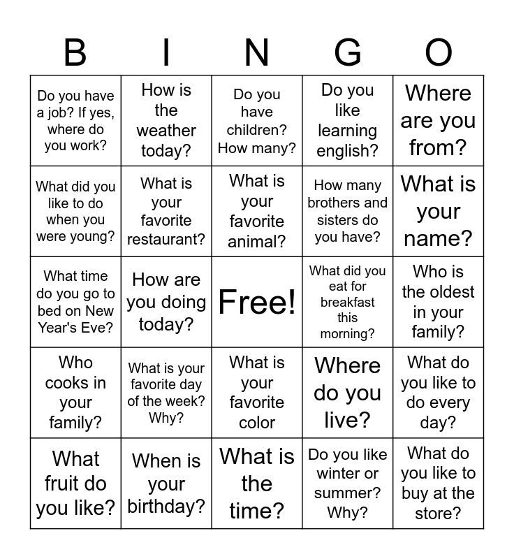 This bingo card has a free space and 24 words: What is your favorite day of the week? Why?, When is your birthday?, What is your favorite animal?, What fruit do you like?, Where are you from?, Do you have a job? If yes, where do you work?, What did you like to do when you were young?, How is the weather today?, What did you eat for breakfast this morning?, What is your favorite color, How many brothers and sisters do you have?, What time do you go to bed on New Year's Eve?, Where do you live?, What do you like to do every day?, What is your favorite restaurant?, Do you like winter or summer? Why?, Who is the oldest in your family?, Do you have children? How many?, What is your name?, How are you doing today?, What do you like to buy at the store?, Who cooks in your family?, Do you like learning english? and What is the time?.
