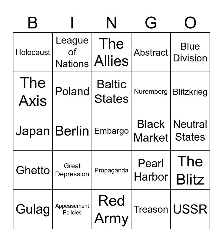 This bingo card has a free space and 24 words: Great Depression, Appeasement Policies, Baltic States, Gulag, Blue Division, Holocaust, The Axis, League of Nations, Black Market, Propaganda, Nuremberg, Japan, Pearl Harbor, The Blitz, Poland, Treason, Neutral States, The Allies, Blitzkrieg, Berlin, USSR, Ghetto, Abstract and Red Army.