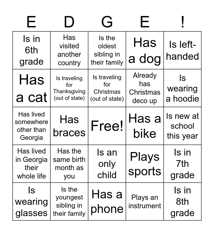 This bingo card has a free space and 24 words: Has the same birth month as you, Is the youngest sibling in their family, Is traveling for Christmas (out of state), Is wearing glasses, Is left-handed, Is in 6th grade, Has a cat, Has visited another country, Has a bike, Is an only child, Already has Christmas deco up, Has lived somewhere other than Georgia, Plays sports, Is in 7th grade, Is traveling for Thanksgiving (out of state), Plays an instrument, Is new at school this year, Is the oldest sibling in their family, Is wearing a hoodie, Has braces, Is in 8th grade, Has lived in Georgia their whole life, Has a dog and Has a phone.