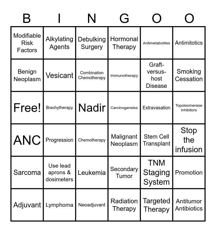 This bingo card has 36 words: Secondary Tumor, Leukemia, Radiation Therapy, Benign Neoplasm, ANC, Carcinogeneiss, Vesicant, Neoadjuvant, Antimetabolites, TNM Staging System, Smoking Cessation, Hormonal Therapy, Promotion, Brachytherapy, Immunotherapy, Modifiable Risk Factors, Sarcoma, Extravasation, Free!, Debulking Surgery, Nadir, Progression, Malignant Neoplasm, Chemotherapy, Stem Cell Transplant, Alkylating Agents, Graft-versus-host Disease, Lymphoma, Combination Chemotherapy, Antimitotics, Antitumor Antibiotics, Adjuvant, Stop the infusion, Topoisomerase Inhibitors, Use lead aprons & dosimeters and Targeted Therapy.