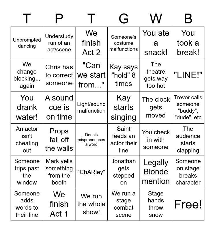 This bingo card has 42 words: Stage hands throw snow, Chris has to correct someone, A phone goes off, The clock gets moved, The audience starts clapping, Props fall off the walls, You drank water!, Marissa is aggressively typing, We finish Act 2, Trevor calls someone "buddy", "dude", etc, Light/sound malfunction, Kay says "hold" 8 times, "LINE!", You ate a snack!, We finish Act 1, An actor isn't cheating out, Someone on stage breaks character, The theatre gets way too hot, Free!, Understudy run of an act/scene, You took a break!, "ChARley", Someone trips past the window, Unprompted dancing, The walls come down, Someone adds words to their line, "Can we start from...", An actor trips past the window, Mark yells something from the booth, Legally Blonde mention, Music sting/spike plays, Kay starts singing, We change blocking... again, You check in with someone, We run the whole show!, Dennis mispronounces a word, Saint feeds an actor their line, A sound cue is on time, Jonathan gets stepped on, We run a stage combat scene, Someone's costume malfunctions and Someone has their script on stage.