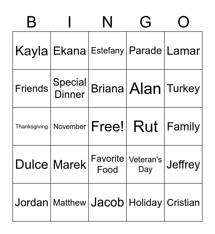 This bingo card has a free space and 24 words: Marek, Matthew, Briana, Jordan, Lamar, Kayla, Friends, Ekana, Rut, Favorite Food, Alan, Thanksgiving, Veteran's Day, Jeffrey, Special Dinner, Holiday, Family, Estefany, Turkey, November, Cristian, Dulce, Parade and Jacob.