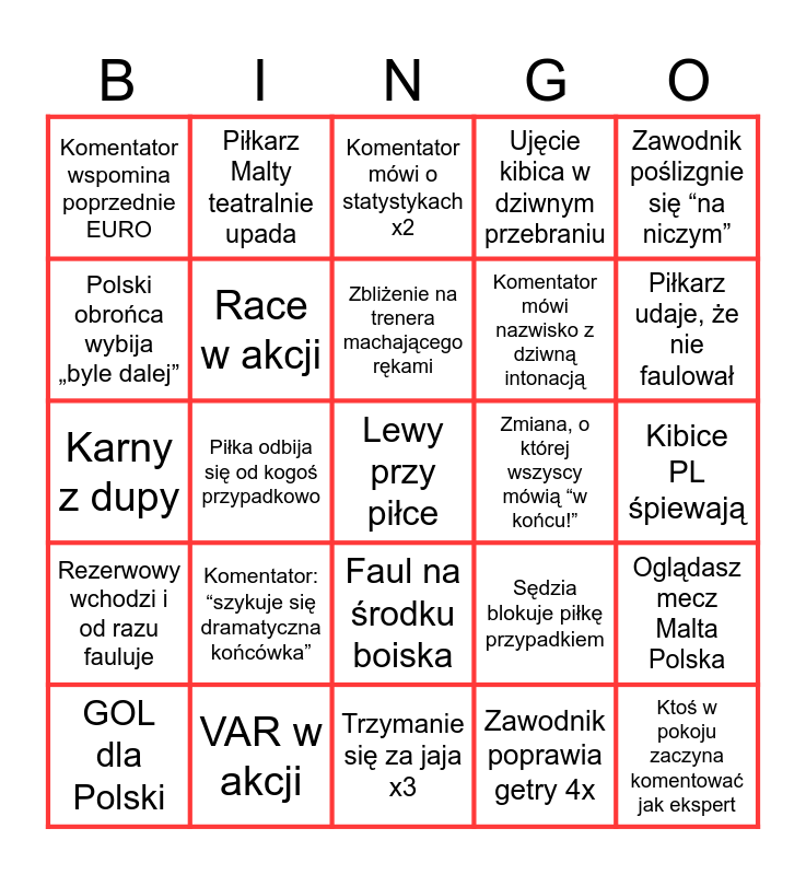 This bingo card has 26 words: Faul na środku boiska, Zawodnik poprawia getry 4x, Zbliżenie na trenera machającego rękami, VAR w akcji, Zawodnik poślizgnie się “na niczym”, Komentator wspomina poprzednie EURO, Polski obrońca wybija „byle dalej”, Piłkarz Malty teatralnie upada, Kibice PL śpiewają, Sędzia blokuje piłkę przypadkiem, Komentator mówi nazwisko z dziwną intonacją, Karny z dupy, Oglądasz mecz Malta Polska, GOL dla Polski, Piłka odbija się od kogoś przypadkowo, Polski bramkarz krzyczy na obronę, Ujęcie kibica w dziwnym przebraniu, Rezerwowy wchodzi i od razu fauluje, Komentator mówi o statystykach x2, Lewy przy piłce, Piłkarz udaje, że nie faulował, Trzymanie się za jaja x3, Zmiana, o której wszyscy mówią “w końcu!”, Komentator: “szykuje się dramatyczna końcówka”, Race w akcji and Ktoś w pokoju zaczyna komentować jak ekspert.