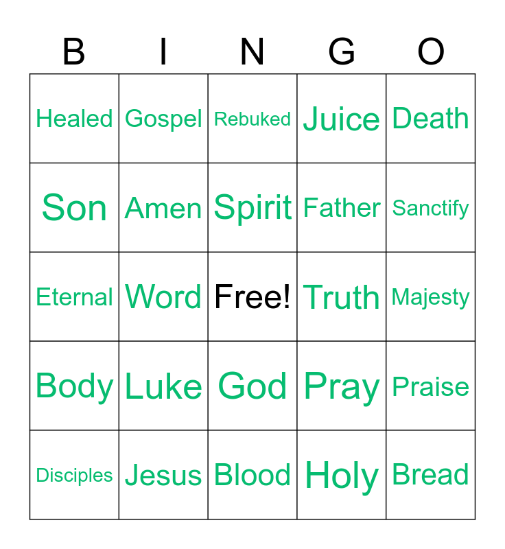 This bingo card has a free space and 24 words: Luke, Jesus, Spirit, Disciples, Death, Healed, Son, Gospel, Truth, God, Father, Eternal, Pray, Praise, Amen, Holy, Majesty, Rebuked, Sanctify, Word, Bread, Body, Juice and Blood.