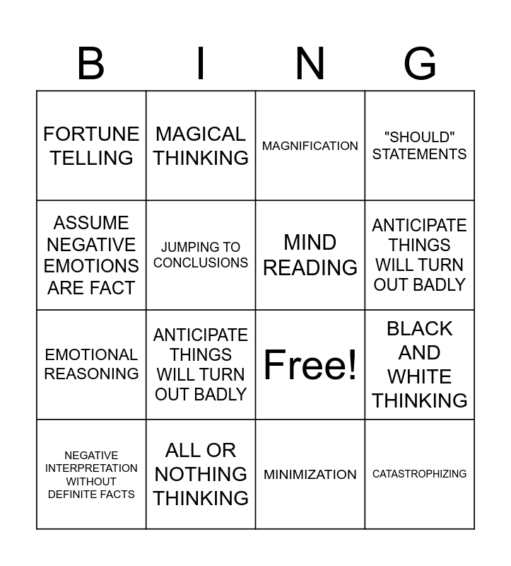 This bingo card has 22 words: ALL OR NOTHING THINKING, OVERGENERALIZATION, MAGICAL THINKING, DISQUALIFYING THE POSITIVE, JUMPING TO CONCLUSIONS, MIND READING, FORTUNE TELLING, MAGNIFICATION, Free!, CATASTROPHIZING, EMOTIONAL REASONING, "SHOULD" STATEMENTS, LABELING, PERSONALIZATION, MINIMIZATION, MAGNIFICATION, BLACK AND WHITE THINKING, NEGATIVE INTERPRETATION WITHOUT DEFINITE FACTS, ANTICIPATE THINGS WILL TURN OUT BADLY, ASSUME NEGATIVE EMOTIONS ARE FACT, ANTICIPATE THINGS WILL TURN OUT BADLY and EXAGERATE THE IMPORTANCE OF THINGS.