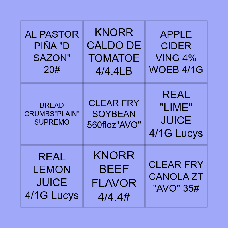 This bingo card has 9 words: REAL LEMON JUICE 4/1G Lucys, APPLE CIDER VING 4% WOEB 4/1G, KNORR CALDO DE TOMATOE 4/4.4LB, BREAD CRUMBS"PLAIN" SUPREMO, AL PASTOR PIÑA "D SAZON" 20#, REAL "LIME" JUICE 4/1G Lucys, CLEAR FRY SOYBEAN 560floz"AVO", CLEAR FRY CANOLA ZT "AVO" 35# and KNORR BEEF FLAVOR 4/4.4#.