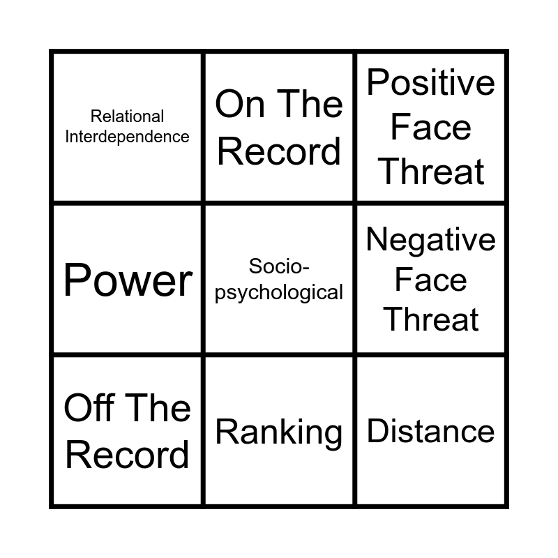 This bingo card has a free space and 8 words: Negative Face Threat, Positive Face Threat, On The Record, Off The Record, Relational Interdependence, Distance, Power and Ranking.