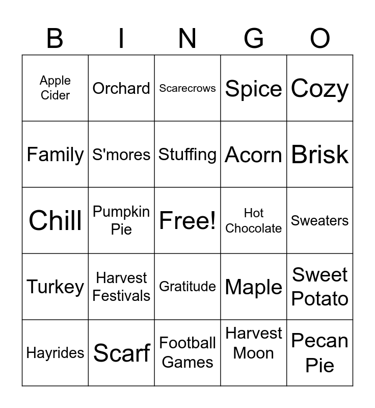This bingo card has a free space and 29 words: Hayrides, Bonfires, Pumpkin Pie, Fall Foliage, Apple Cider, Scarecrows, S'mores, Harvest Festivals, Hot Chocolate, Scarf, Sweaters, Pecan Pie, Football Games, Harvest Moon, Brisk, Cranberry Sauce, Gratitude, Turkey, Cozy, Chill, Maple, Leaves, Acorn, Family, Spice, Orchard, Sweet Potato, Stuffing and Butternut Squash.