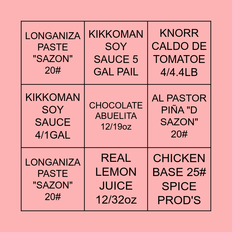 This bingo card has 9 words: LONGANIZA PASTE "SAZON" 20#, KNORR CALDO DE TOMATOE 4/4.4LB, KIKKOMAN SOY SAUCE 5 GAL PAIL, KIKKOMAN SOY SAUCE 4/1GAL, LONGANIZA PASTE "SAZON" 20#, AL PASTOR PIÑA "D SAZON" 20#, CHOCOLATE ABUELITA 12/19oz, CHICKEN BASE 25# SPICE PROD'S and REAL LEMON JUICE 12/32oz.