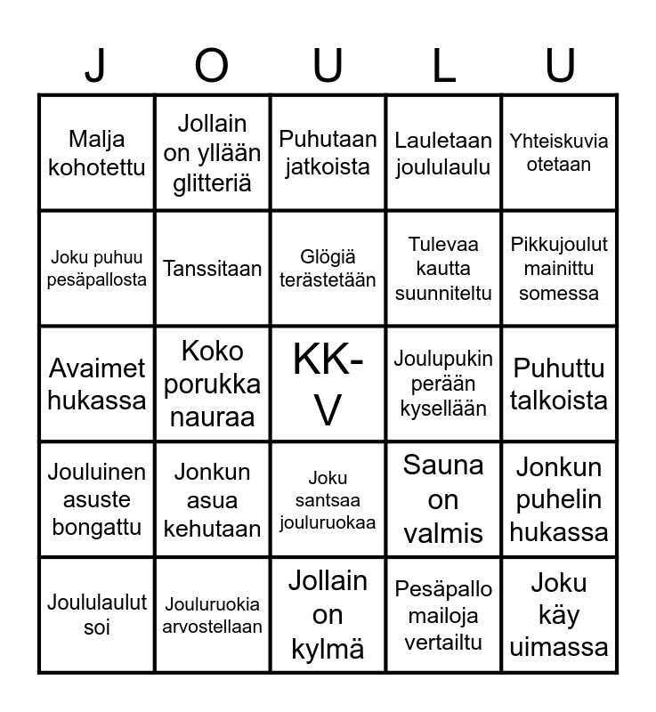 This bingo card has a free space and 25 words: Jonkun asua kehutaan, Jollain on kylmä, Glögiä terästetään, Joululaulut soi, Yhteiskuvia otetaan, Malja kohotettu, Joku puhuu pesäpallosta, Jollain on yllään glitteriä, Joulupukin perään kysellään, Joku santsaa jouluruokaa, Tulevaa kautta suunniteltu, Avaimet hukassa, Sauna on valmis, Jonkun puhelin hukassa, Tanssitaan, Tonttulakki vilahtaa, Puhuttu talkoista, Puhutaan jatkoista, Pikkujoulut mainittu somessa, Koko porukka nauraa, Joku käy uimassa, Jouluruokia arvostellaan, Jouluinen asuste bongattu, Lauletaan joululaulu and Pesäpallo mailoja vertailtu.