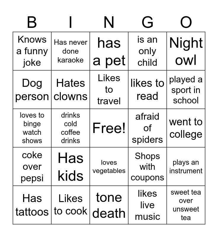 This bingo card has a free space and 24 words: Has kids, Likes to cook, Likes to travel, Has tattoos, Night owl, Knows a funny joke, Dog person, Has never done karaoke, afraid of spiders, loves vegetables, likes to read, loves to binge watch shows, Shops with coupons, plays an instrument, Hates clowns, likes live music, went to college, has a pet, played a sport in school, drinks cold coffee drinks, sweet tea over unsweet tea, coke over pepsi, is an only child and tone death.