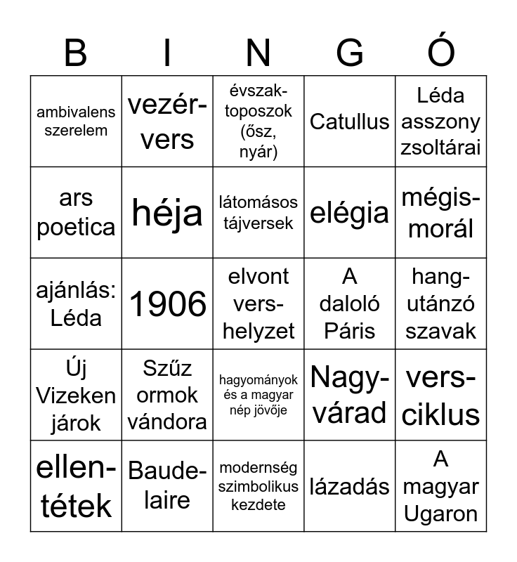 This bingo card has 25 words: Szűz ormok vándora, modernség szimbolikus kezdete, látomásos tájversek, ellen-tétek, Léda asszony zsoltárai, ambivalens szerelem, ars poetica, vezér-vers, A daloló Páris, hagyományok és a magyar nép jövője, elégia, ajánlás: Léda, Nagy-várad, vers-ciklus, héja, A magyar Ugaron, hang-utánzó szavak, évszak-toposzok (ősz, nyár), mégis-morál, 1906, elvont vers-helyzet, Baude-laire, Új Vizeken járok, Catullus and lázadás.