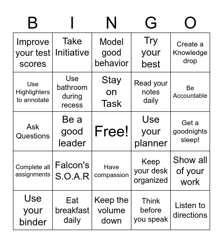 This bingo card has a free space and 24 words: Falcon's S.O.A.R, Eat breakfast daily, Stay on Task, Use your binder, Create a Knowledge drop, Improve your test scores, Use Highlighters to annotate, Take Initiative, Use your planner, Have compassion, Read your notes daily, Ask Questions, Keep your desk organized, Show all of your work, Use bathroom during recess, Think before you speak, Get a goodnights sleep!, Model good behavior, Be Accountable, Be a good leader, Listen to directions, Complete all assignments, Try your best and Keep the volume down.